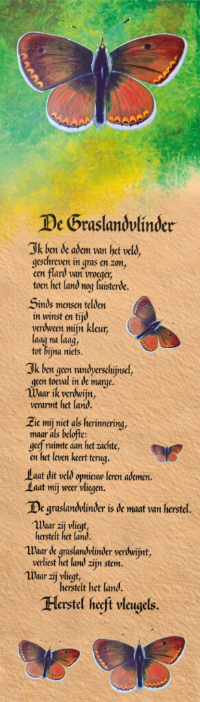 Tot slot: Een graslandvlinder is een prachtige indicatiesoort voor het herstel van biodiversiteit in onze omgeving. Wat zou het mooi zijn als we er samen in slagen onze kinderen en kleinkinderen ook daarvan te laten genieten!