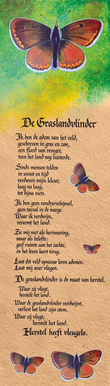 Tot slot: Een graslandvlinder is een prachtige indicatiesoort voor het herstel van biodiversiteit in onze omgeving. Wat zou het mooi zijn als we er samen in slagen onze kinderen en kleinkinderen ook daarvan te laten genieten!