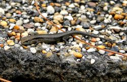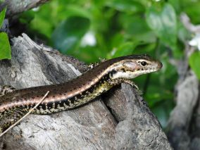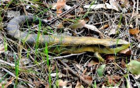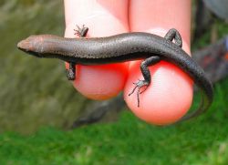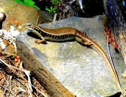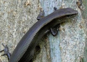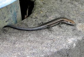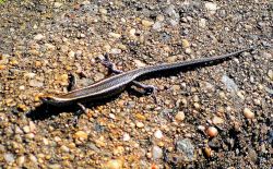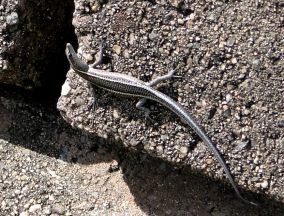 Een van de meest voorkomende hagedissen is de Grass Skink Lampropholis delicate met een totale lengte van 9 cm. Het bruinzwarte diertje - dat in veel tuinen, grasland en open bossen voorkomt - heeft een lichtere zijstreep die loopt van de neus naar de lies. Onder het wandelen langs de kreek schoten de hagedisjes pijlsnel voor onze voeten vandaan. Ze leven van spinnen, mieren, kevers, larven, duizendpoten en allerlei andere kleine diertjes. Ze leggen twee tot vijf eieren, die in februari/maart uitkomen. De kop-romplengte van de jongen bedraagt ongeveer 16 mm. Net als bij de Ringslang Natrix natrix het geval kan zijn, kunnen er meerdere vrouwtjes op een geschikte plek hun eieren afzetten en zijn er wel meer dan 400 eieren op dezelfde plek gevonden.