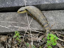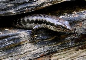 Een hagedis die heel wat groter wordt dan bovengenoemde dieren is de Eastern Water Skink Eulamprus quoyii. De totale lengte bedraagt ongeveer 25 cm. Zoals alle skinken bezit het dier gladde schubben, waardoor het in de zon ligt te glimmen. De dieren zijn goud-olijfbruin van boven met donkere vlekjes. Een smalle witte tot vaalgele streep loopt vanaf het oog naar de staart. Onder deze lichte streep loopt een donkere baan. De buikzijde is crȇmewit. Zoals de naam al aangeeft zijn de dieren vooral te vinden in de buurt van water. Deze massaal voorkomende hagedis is levendbarend en krijgt twee tot negen jongen die worden geboren in december/januari. Naarmate de tijd vorderde zagen we de zwangere vrouwtjes geleidelijk aan dikker worden. Het voedsel bestaat uit tal van ongewervelden, kikkerlarven, maar ook bessen. Sommige dieren waren tot op een meter te benaderen, anderen vluchten op een afstand van ongeveer vijf meter reeds. Langs het fietspad werden enkele doodgereden dieren gevonden en tal van dieren misten gedeelten van de staart.