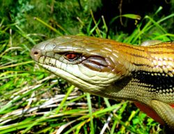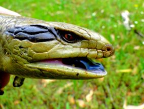 De meest en het best onderzochte hagedis is wel de Eastern Blue-tongued Lizard Tiliqua scincoides en vrijwel iedereen kent dit dier. Bijna op elke ronde langs de kreek werden wel een of meerdere exemplaren gezien. De meeste dieren werden gevonden rond 11 uur ’s ochtends bij gesluierd zonlicht. Ze liggen dan te zonnen met gesloten ogen en ongeveer 30 cm vanaf de veilige begroeiïng. De fraaie skinken zijn dan eenvoudig te benaderen en op te pakken. De rugzijde is zilvergrijs tot geelbruin met een serie donkere dwarsbanden tot over de staart. De kop is lichtbruin met een donkere baan achter het oog tot aan de ooropening. De totale lengte is gewoonlijk 40-45 cm. De poten zijn erg kort. Opvallend is de grote en brede kobaltblauwe tong, die sterk afsteekt tegen het rose van de mondholte en die ter afschrikking wordt uitgestoken bij een aanval van een predator. Groot was de verrassing dan ook dat we op het reeds genoemde kerkhof - een plek waar we ze niet verwacht hadden - deze hagedis eveneens vonden. Van januari tot februari baart het dier vijf tot twintig jongen met een lengte van ongeveer 15 cm. Tot het menu behoren zowel huisjes- als naaktslakken, fruit en insecten. Helaas worden deze onschuldige dieren vaak met de erg giftige Death Adder Acanthophis antarcticus verward en gedood, omdat hun kleine poten vaak niet te zien zijn in het gras. Hoewel het rustige dieren zijn, kunnen ze bij onhandig beetpakken - aangezien ze zelfs huisjesslakken kunnen kraken - met hun sterke kaken zeer pijnlijk bijten.