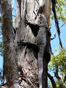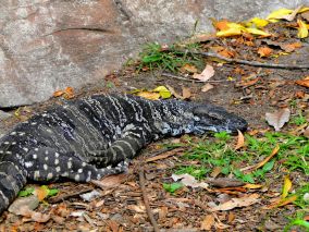 Een weekend naar de dochter van ons gastgezin in Glenhaven, een plaats die een kleine 30 km vanaf ons logeeradres ligt, leverde de verrassing van de vakantie op. In het Holland Reserve Park vonden we een Lace-monitor Varanus varius, een hagedis die meer dan twee meter lang kan worden. Net als slangen hebben deze grote en sterke hagedissen een gevorkte tong waarmee ze geurstoffen kunnen opnemen en analiseren in een goed ontwikkeld orgaan van Jacobson. De kleur van de bovenzijde is blauwzwart met geelachtige vlekken. De onderzijde heeft geelachtige dwarsbanden, evenals meestal de voorpoten. Het dier dat zich bij onze komst op de grond bevond, vluchtte met veel lawaai door de op de grond liggende droge bladeren, klom pijlsnel in de dichts bijzijnde Eucalyptusboom en bleef halverwege de dikke stam hangen. Goed waren de forse poten met de zeer krachtige klauwen te bestuderen en de lengte van het dier werd op ongeveer 150 cm geschat. Volwassen dieren kunnen een gewicht van 20 kg bereiken. Alle waranen zijn eierleggend en deze soort legt de zes tot twintig perkamentachtige eieren in een termietenheuvel in december en vroeg in januari. Bij het uitkomen meten de jongen ongeveer 30 cm. Het voedsel van Goanna’s bestaat uit insekten, reptielen, warmbloedige dieren, maar ook vogels en eieren worden in bomen buitgemaakt. Vaak wordt het dier langs de kant van de weg waargenomen, waar het zich te goed doet aan het eten van doodgereden dieren. Ook op picknickplaatsen worden de hagedissen wel waargenomen, waar ze dan het afval eten, wat mensen hebben achtergelaten. Waranen zijn de enige hagedissen die door spreiding van het tongbeenapparaat en het laten zakken van de mondbodem hun keelgat zeer sterk kunnen vergroten en zo in staat zijn onevenredige grote prooien te verslinden. Goanna’s zijn het lievelingsvoedsel van de oorspronkelijke bewoners van Australië, de Arborigines. Van het vet van de dieren - samen met nog andere ingrediënten - wordt een medicijn gemaakt dat werkt tegen reumatische aandoeningen