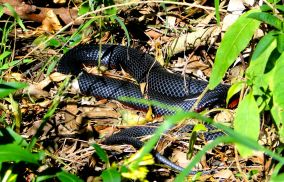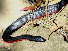 De Red-bellied Black Snake Pseudechis porphyriacus - één van de meest voorkomende slang in de Sydney-regio - werd op elke ronde wel één of meerdere keren gevonden. Het is een zeer fraaie slang die gitzwart van kleur is en erg glimt. Op een afstand lijkt het net een weggeworpen, zwarte, natte binnenband van een fiets. De buikzijde is dofrood of rose gekleurd. Sommige individuen hebben een lichtbruine tot grijze snuit. De maximum lengte kan 250 cm bedragen, maar gemiddeld zijn ze ongeveer 125 cm. Meestal verdwijnt het dier met grote snelheid, maar als het zich bedreigd voelt wordt de nek verbreed en gaat het dier luid sissen. Net als onze Ringslang kan het een onwelriekende substantie uit de cloaca afscheiden. Maar dat alles is maar bluf. Probeer het dier overigens niet te pakken want bij een beet is absoluut doktershulp nodig. Grote exemplaren kunnen zelfs dodelijk zijn. Deze slang is levendbarend en krijgt vijf tot twintig jongen die tussen februari en april worden geboren en 20 cm lang zijn. Net als onze Adder Vipera berus wordt er tussen de mannetjes een rivaliteitsdans uitgevoerd waarbij ze de nek verbreden en wordt er geprobeerd de tegenstander met het voorste gedeelte van het lichaam neer te drukken. De winnaar mag met het vrouwtje paren. We vonden de slang vaak zonnend bij heet weer en ongeveer een meter uit de veilige begroeiïng. Naarmate de zomer naderde en de temperatuur nog hoger werd, werden ze minder vaak waargenomen. Soms maakten de dieren zich uitermate snel uit de ’voeten’, soms waren de dieren tot op enkele meters te benaderen. Ook werden jonge en halfwas dieren aangetroffen. Hun voedsel bestaat uit kikkers, hagedissen en slangen, inclusief hun eigen soort.