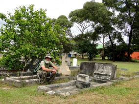 Op weg naar de Prospect Creek passeerden we steeds een oud, min of meer verwaarloosd kerkhof, dat overigens nog wel in gebruik was. Vanaf de weg zagen we dan talloze hagedisjes wegschieten onder en tussen de grafstenen. We besloten dan ook een bezoekje te brengen aan het kerkhof. En daarna hebben we daar nog vele uren doorgebracht. Zelden hebben we zoveel leven op een kerkhof gevonden. Het wemelde er van de Fence Skinken. Bij benadering verdwenen ze vliegensvlug onder en tussen de grafzerken. Ook de Grass Skink werd hier gevonden evenals Garden Skink. De grootste verrassing was echter het vinden van de Eastern Blue-tongued Lizard. De dieren maken daar gebruik van de verzakte zerken om daar hun hol onder te maken. Zo gauw het weer geschikt werd kwamen ze te voorschijn om op de grafstenen te zonnen. In ieder geval werden daar op één ronde maar liefst vijf volwassen exemplaren gevonden.