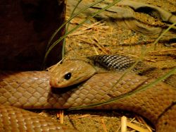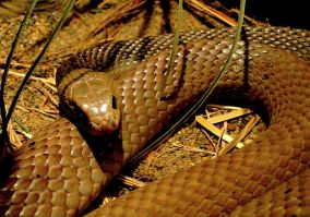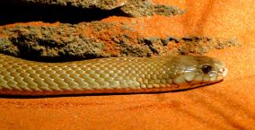 De Eastern Brown Snake Pseudonaja textilis werd slechts eenmaal gevonden. Het dier lag te zonnen, half verborgen in de vegetatie. Nog voor ik echt goede foto's kon maken verdween de slang met grote snelheid. Het dier was lichtbruin van kleur, maar deze bruine kleur kan nogal variëren. Jonge dieren zijn levendiger gekleurd en hebben smalle, donkere banden over de rug en de bovenkant van de kop is zwart. Sommige volwassen dieren behouden deze donkere banden, al zullen ze erg vervagen. Deze dodelijke slang kan een lengte van 230 cm krijgen, maar meet gemiddeld 130 cm. Normaliter zal elke slang de mens vermijden. Maar als deze slang verrast wordt is ze erg aggressief en zal zich oprichten om te bijten. Deze slang komt voor in tal van biotopen. Het dier is eierleggend. De 10 tot 30 eieren worden afgezet in december/januari. De jongen zijn 23 tot 30 cm lang. Tot hun voedsel behoren hagedissen, kleine warmbloedige dieren en kikkers. Vaak werd ons tijdens de tochten gevraagd waar wij op naar zoek waren. Als we zeiden naar reptielen te zoeken dan kwam de Red-bellied Black Snake vaak ter sprake. Als we zeiden de Brown Snake ook te hebben gevonden, zagen wij de mensen schrikken. Steeds weer werd gevraagd aan welke kant van de kreek. Natuurlijk stelden wij hen gerust met de woorden: aan de andere kant. Uiteindelijk leidde dit er toch toe dat op het clubgebouw van het naburige sportveld een bordje werd geplaatst met de tekst: ’Warning Snakes!’