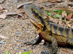 Een van de fraaiste en grootste hagedissen die bij de Prospect Creek wordt gevonden is ongetwijfeld de Eastern Water Dragoon Physsignathus lesueurri. Dit dier komt in grote hoeveelheden voor. Ze kunnen maar liefst 90 cm lang worden, maar de gemiddelde lengte bedraagt ongeveer 60 cm. De rug is grijs tot olijfgroen met donkere dwarsstrepen. Een donkere streep loopt vanaf het oog tot over de ooropening. De buikzijde is crȇme-achtig van kleur, maar bij mannetjes vaak helder rood. De kop en nek vertonen een soort kam van stekelige schubben. Het dier bewoont rivieren en kreken en wordt meestal vaker gehoord dan gezien. Bij onraad laten ze zich namelijk met een luide plons van grote hoogte uit een boom in het water vallen en zwemmen op krokodilachtige wijze snel naar de kant. Ze kunnen geruime tijd onder water blijven. Soms zijn de dieren echter tot op anderhalve meter te benaderen. De dieren hebben een territorium en de mannetjes dulden geen ander mannetjes in de buurt. Het menu bestaat uit insekten, fruit, bessen en kikkers. Vrouwtjes leggen acht tot twintig perkamentachtige eieren. De jongen zijn bij de geboorte ongeveer 15 cm lang. We zagen naast volwassen dieren ook erg veel jonge en halfwas dieren. Deze grote hagedis moet voorzichtig behandeld worden, aangezien hij flinke wonden kan veroorzaken.