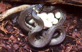 In tegenstelling tot onze beide andere slangen, baart de ringslang geen levende jongen, maar eierleggend. Slangen kennen - uitgezonderd enkele wurgslangen - geen broedzorg. Zodra het vrouwtje haar eieren heeft afgezet dan is haar klus daarmee geklaard en laat ze het uitbroeden verder over aan de natuur. Om de eieren uit te laten komen moet natuurlijk een geschikte plek worden gevonden. Zo kunnen eieren worden afgezet onder mosplakkaten, in holle en vermolmde boomstronken, hopen houtsnippers en in mest- en composthopen. Al deze plekken moeten de dezelfde eigenschappen bezitten. De dieren moeten er gemakkelijk in kunnen komen, er moet ruimte zijn om een groot aantal eieren af te zetten, het moet vochtig zijn en er moet broei in kunnen ontstaan.