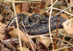 We mossen now hiel veurzichtig lopen neffens Andries. We mochten nog wel een betien zaggies praoten mar ik moch veural niet mit mien voeten lopen te stampen. Adders en slangen zien wel goed, heuren een stok minder mar ze bin veural hiel gevulig veur trillings op de grond, zee mien grote leermeester. Nog gien peer honderd meter veerder was’t al raek. Op een klein kael plakkien lagen daor zomar inienend twie adders nog krek mit de stat onder een struke lekker in ‘t zunnegien te bakken. ’t Weren trouwes gien gien adders mar ringslangen verbeterde Andries. “En weej’ hoej’ dat zien kunnen”, fluusterde hi’j. “Misschien omdat ze gien poten hebben... ”, begon ik.