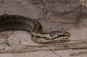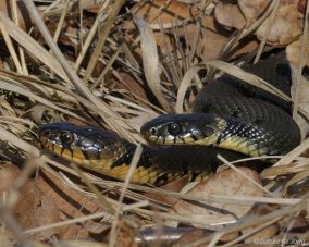 Een ringslange herken ie an zien bruun-grieze kleur an de boverkaante en een zwat-wit vlekte onderkaante en hi’j het vaeks een briede streep om zien nekke. Hi’j heurd trouwes tot de fe-milie van de waeterslangen(!). Soms ziej’ wat wit-oranje-gelige vlekken vlak aachter de kop. Dissen die wi’j zaggen, weren omdebi’j een zeuventig centimeter schatten we, mar ze kun wel meer as een meter laank wodden zee Andries. Hiel veurzichtig en tegen de wiend in, kowwe d’r nog dichterbi’j kommen. Op een meter of drie, viere bleven we d’r een schoffien naor staon te kieken. Ze lagen hiel stillegies te soezen, zo leek et. Doe d’r wat beweging in kwam dee ik et haost in mien broek. Dat was beslist niet neudig zee Andries want ringslangen bieten niet en bin ok niet giftig. Een hiele geruststelling veur een ‘netuurfreak’ zoas ik.