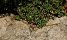 Een andere grote slang die op Lesbos voorkomt is de Hagedisslang. Het is een dier dat wordt aangetroffen in warme, droge biotopen en het geeft de voorkeur aan open rotsachtige en zandige terreinen, maar wordt ook wel gevonden in open bossen en bouwland. Het dier is te herkennen aan het smalle frontaalschild, de overhangende ’wenkbrauwen’, de grote ogen en de bovenkaak die voorbij de onderkaak steekt. Bij enkele verkeersslachtoffers waren al deze kenmerken goed te zien. Ook dit is een agressieve slang, waarvan de volwassen mannetjes een lengte kunnen bereiken van twee meter; de vrouwtjes worden meestal niet groter dan 1.40 m. Het dier is giftig en de giftanden staan achter in de bek. De beet bij prooidieren (hagedissen, slangen en zoogdieren) moet daarom zorgvuldig gebeuren. De prooidieren worden binnen enkele minuten gedood. Een beet bij de mens openbaart zich door stijfheid en door verlamming en zwelling van het gebeten lichaamsdeel. Er kan zelfs koorts ontstaan. Al deze symptomen verdwijnen gewoonlijk na een paar uren. Ik betrapte een Hagedisslang die net een volwassen Reuzensmaragdhagedis had gevangen en daarmee onder een struik vluchtte. Toen ik een kwartiertje opnieuw langs de plek kwam, lag de slang er nog, maar was er van de hagedis al niets meer te zien. De vrouwtjes leggen gewoonlijk 4-14 langgerekte eieren die na ongeveer twee maanden uitkomen.