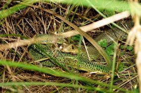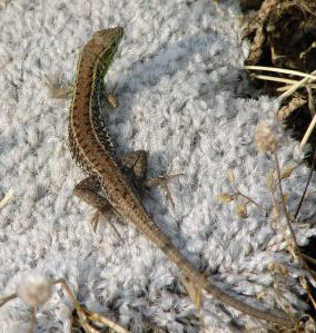 Reptielen zien we genoeg tijdens onze wandel- en fietstochten. Vooral de fraaie groengekleurde Reuzensmaragdhagedis wordt erg vaak waargenomen. Het dier bewoont tal van biotopen. We vinden het in de tuin van ons appartement, in struikgewas, bermen en op rotsformaties. De dieren krijgen een kop-romplengte van 16-20 cm. De mannetjes zijn effen groen van kleur met een blauwe vlek achter de kaken. De vrouwtjes vertonen lichte lengtestrepen over de rug. Jonge en halfwas dieren zijn bruinachtig met drie of vijf lichtgekleurde lengtestrepen op rug en flank. De Reuzensmaragdhagedis is nauw verwant aan Smaragdhagedis Lacerta viridis. De jongen van de Smaragdhagedis zijn te onderscheiden van de Reuzensmaragdhagedis doordat ze twee of vier lichte strepen hebben. Overigens levert een goede determinatie op Lesbos geen moeilijkheden op, aangezien de Smaragdhagedis hier niet voorkomt. Vrouwtjes zetten gewoonlijk 7-14 eieren af, de jongen worden ongeveer na 11-14 weken geboren.