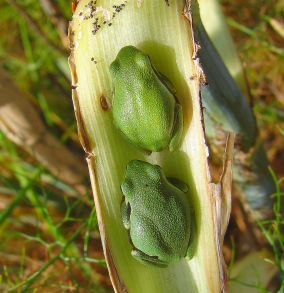 Langs het Meer van Kalloni - een biotoop bij uitstek -vinden we op onze zoektochten elk jaar maar een enkele Boomkikker. De dieren zitten dan op takken van de bosjes rond het meer. Ook worden ze gezien op de bladeren van een bamboeachtige rietsoort. De oorzaak van het weinig zien van deze soort is vermoedelijk de grote drukte overdag. Dit is namelijk een zeer geliefde plek voor de vele vogelaars die rond deze tijd het eiland in hun ’bezit’ nemen. Maar ook door de voortreffelijke schutkleur zijn deze fraaie helgroene kikkertjes in de struiken erg moeilijk te vinden. Alleen ’s nachts blijkt dat er grote hoeveelheden dieren moeten zitten. Hun gekwaak – samen met dat van de groene kikker - maakt dan een oorverdovend lawaai. In Skala Kalloni werden langs een drassig terrein honderden juveniele dieren gevonden. Ze zaten grotendeels in de - tussen het water en de weg groeiende - struiken van de Dille. Sommigen waren pas gemetamorfoseerd en nog in het bezit van een flinke staart. Zo telden we over een afstand van ongeveer 50 meter meer dan 85 exemplaren. Ze zitten overdag langdurig in de brandende zon en laten zich dan goed bekijken. Om uitdroging door de zon tegen te gaan, maken ze zich bolvormig, sluiten de ogen en trekken de ledematen onder het lichaam. Opvallend zijn hier ook weer de verschillende kleurschakeringen van de diertjes. Behalve groene en bruine, worden zelfs goudkleurige dieren gevonden.