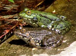 De groene kikkers zijn rondom Skala Kalloni zeer talrijk. Overal waar water is worden ze gezien en gehoord. Zowel ’s nachts als overdag zijn de luide kikkerconcerten niet van de lucht. Het gaat om een flink uit de kluiten gewassen, groene kikker. Wat de roep betreft, maar ook de kleine, platte metatarsusknobbel, ontegenzeggelijk de Meerkikker Rana ridibunda, zoals ook lang gedacht is. Echter, de Duitse onderzoeker Jörg Plötner die studie aan deze dieren heeft verricht, meldt dat het DNA van deze dieren sterke gelijkenis vertoont met die van het Anatolische vasteland (Turkije). Het dier luistert nu naar de naam Rana bedriagae. De dieren, die erg variabel van kleur zijn, zitten vaak uren in de brandende zon en worden in de plaats Kalloni bij honderden in een dan bijna droge betonnen rivierbedding gezien. Het valt op dat ze graag groepjes vormen.