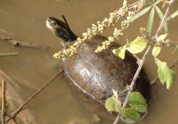 Deze waterschildpadden eten zowel plantaardig als dierlijk voedsel. Dat ze verre van kieskeurig zijn bleek toen we op een plek kwamen waar de dieren regelmatig met brood werden gevoerd. De dieren zijn hier zo aan gewend dat ze bij onze komst massaal kwamen aangepeddeld.